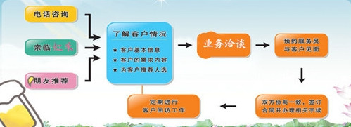 ****步:客户通过电话咨询、亲临公司、朋友介绍了解我们; ****步:了解客户的需求,导入产品; 第三步:与客户洽谈合作事宜; 第四步:业务员上门洽谈 第五步:双方签订合同,建立合作关系; 第六步:售后服务